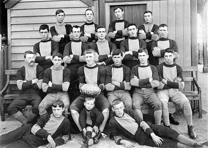 A football team. The man in the middle holds a football with '2nd mpo (?) 1908' written on it.