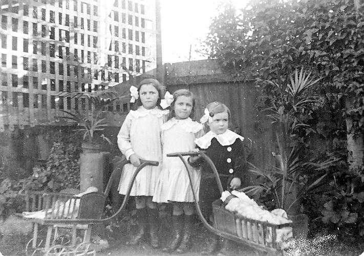 Three small girls with their prams in a back yard.