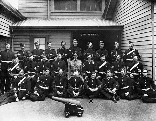 Members of the Victorian Artillery in uniform. There is a cannon in front of the group. One man is marked with an 'x'.