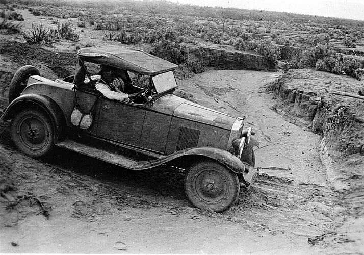 A car on road to Wentworth. It is driving across a dry creek bed.