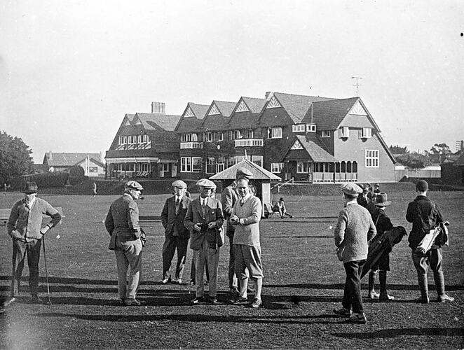 Men playing golf at the Sandringham Golf Club. The clubhouse in the background.