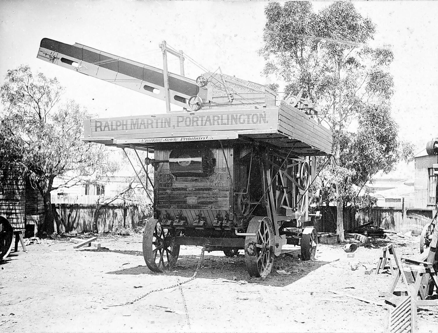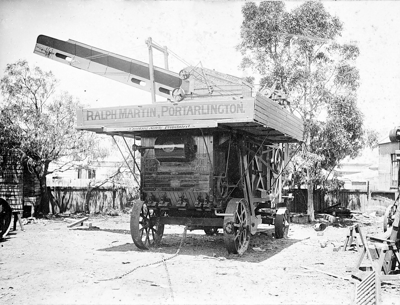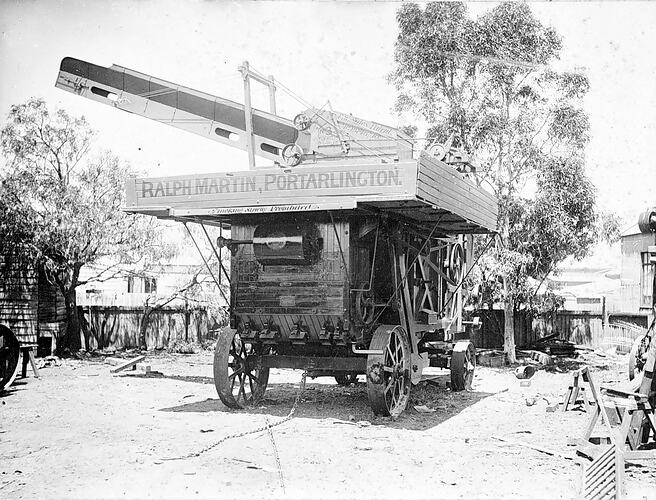 Travelling threshing machine of contractor Ralph Martin, Portarlington, Victoria. The threshing machine is fitted with a patent sheaf elevator and feeder labelled "P.W. Sides' Patent, No.19746/10. No.3, Sawmill, ???, Geelong"