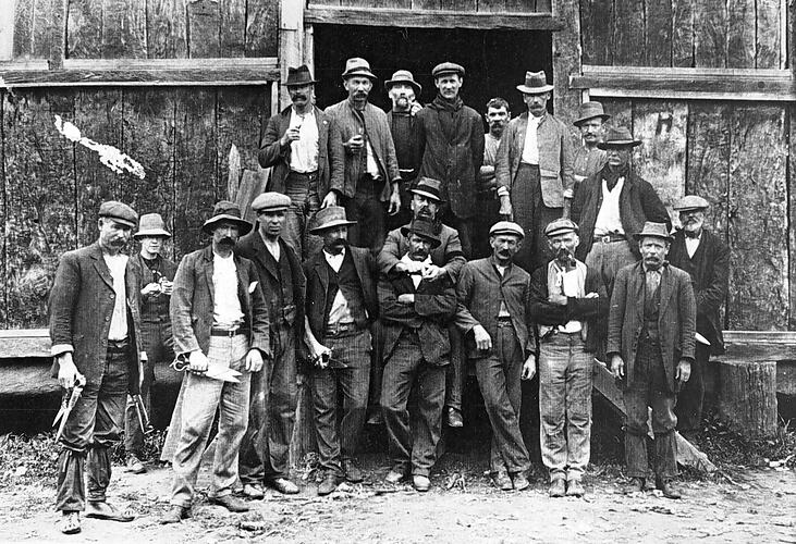 A group of shearers in front of a shearing shed. Some are holding blade shears.