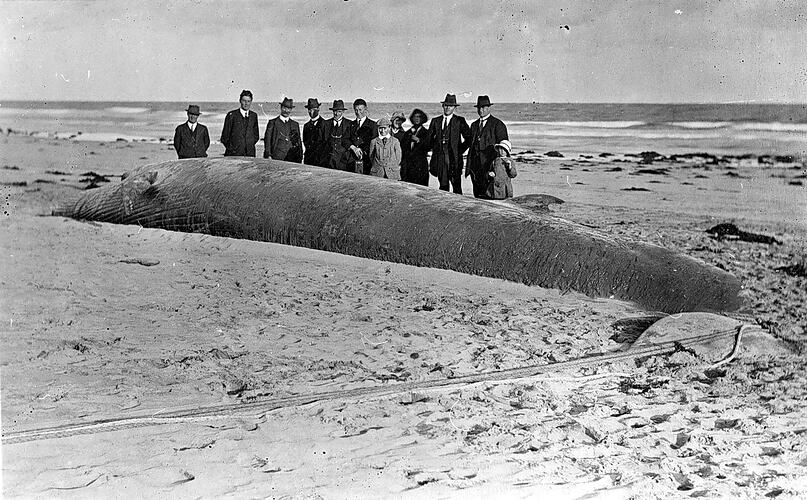 A group of people with a whale which has been washed up on the beach.
