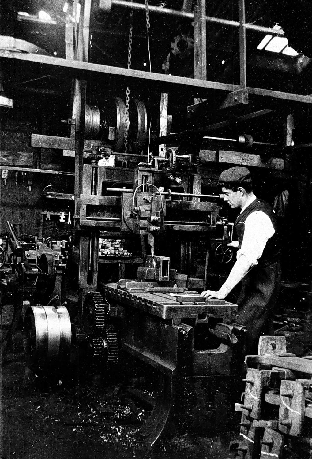 A man working a planing machine in the machine shop at Trewhella Bros foundry.