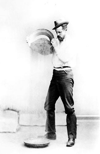 A man demonstrating panning for gold. He is pouring out the contents of the pan. (see also MM 007286-7289).