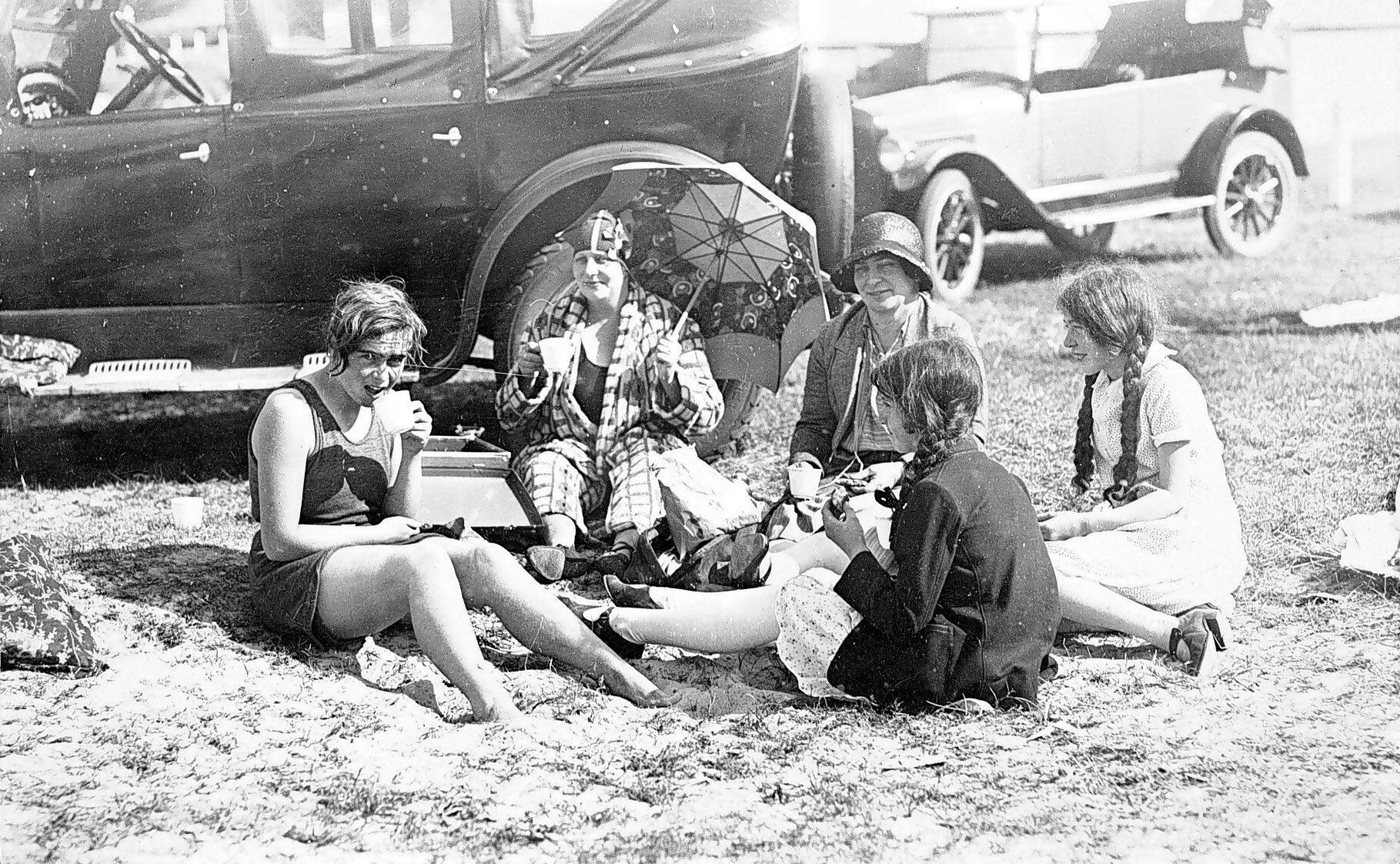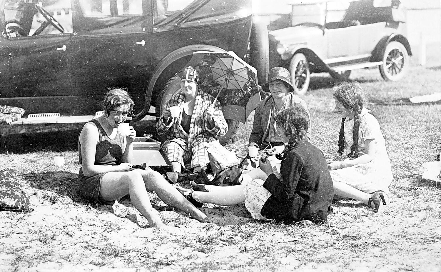 Members of the Read family picnicking on the beach. There are two cars in the background.
