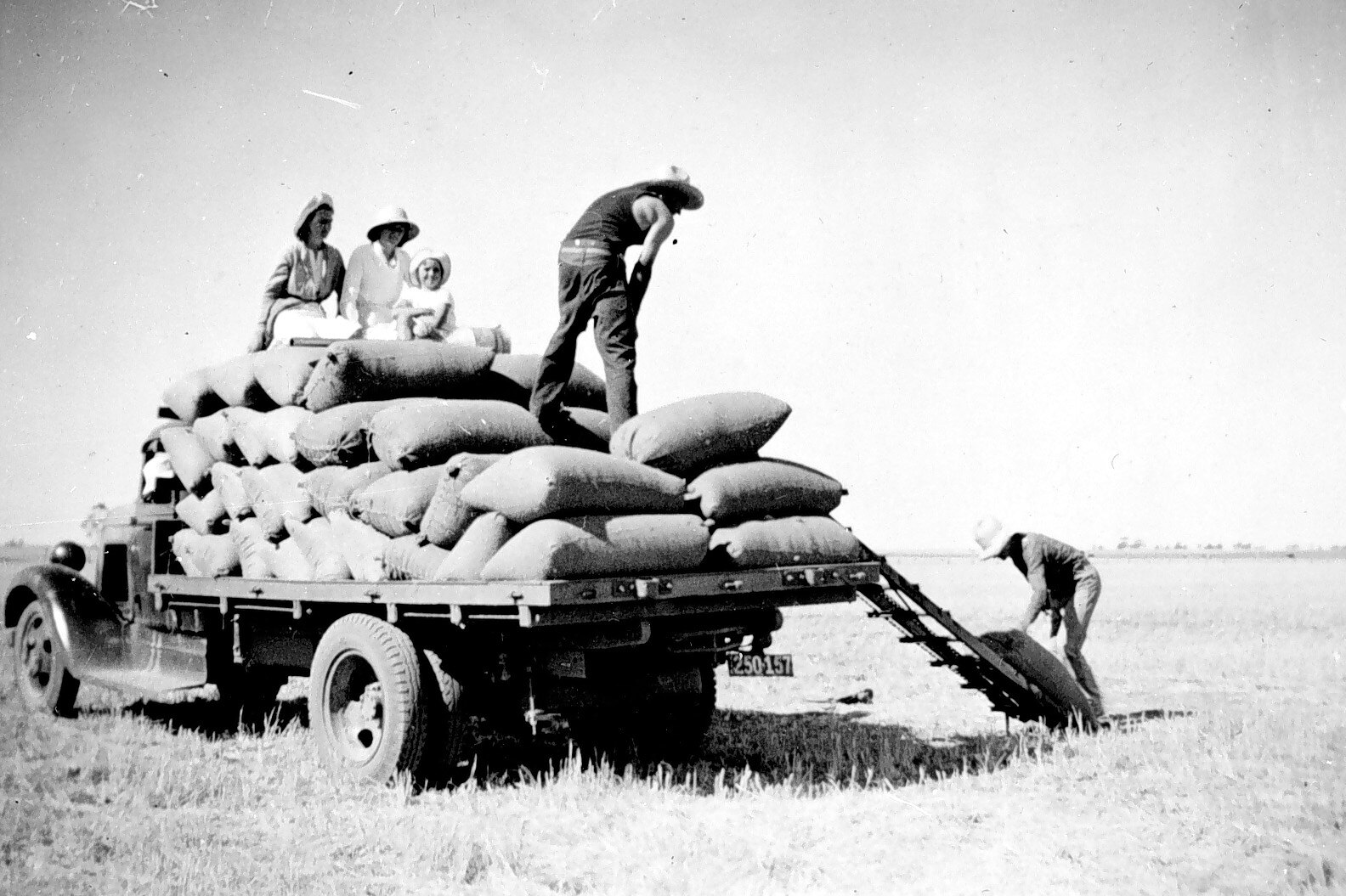 Two men loading sacks of grain onto a truck. Two women and a child watch from the top of the truck.