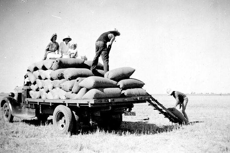Agricultural Equipment, Agricultural Workers, Cereal Crops, Farms, Motor Trucks, Sacks, Farmers, Women on Farms, Women in Agriculture, Rural Life, Rural Women