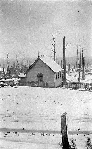 The Church of England in Beech Forest under snow. The trees behind have apparently been through a bushfire.