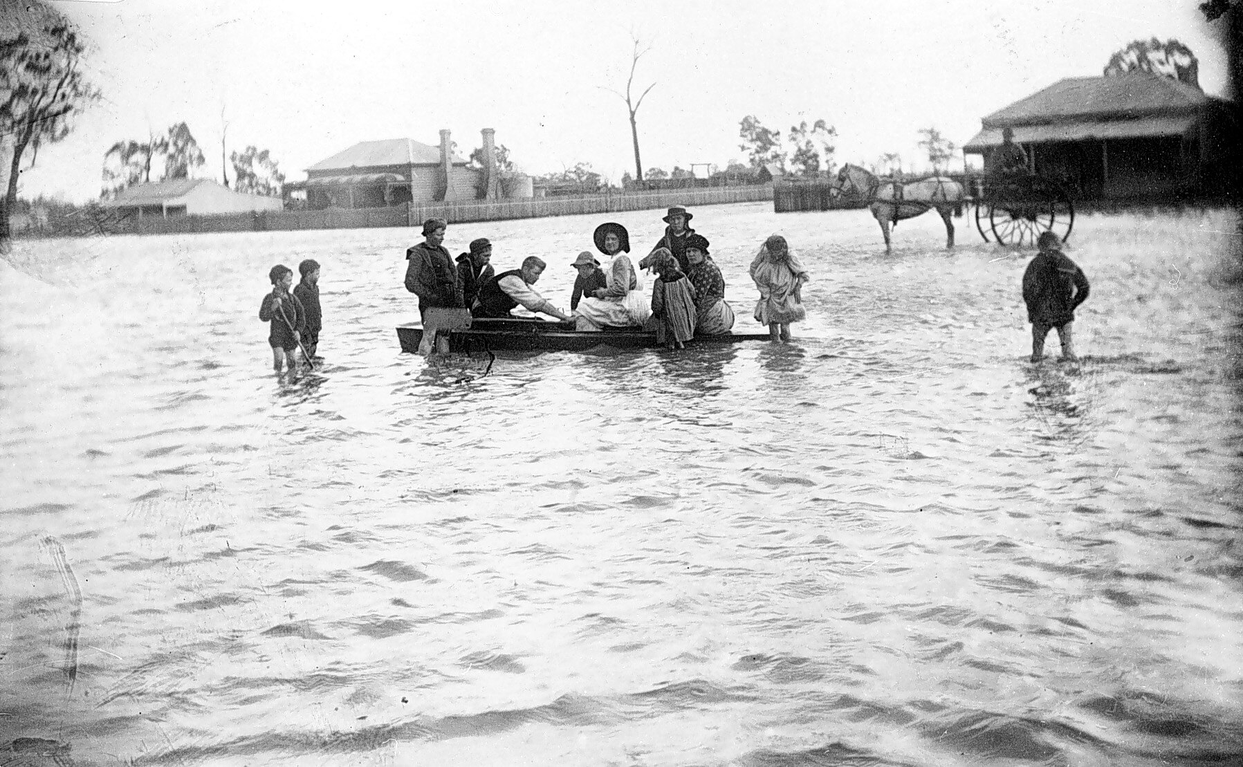 Floodwaters in Inglewood. A group of people are in a rowboat which appears to be aground. Children stand knee deep in the water around the boat and there is a horse and cart in the background.