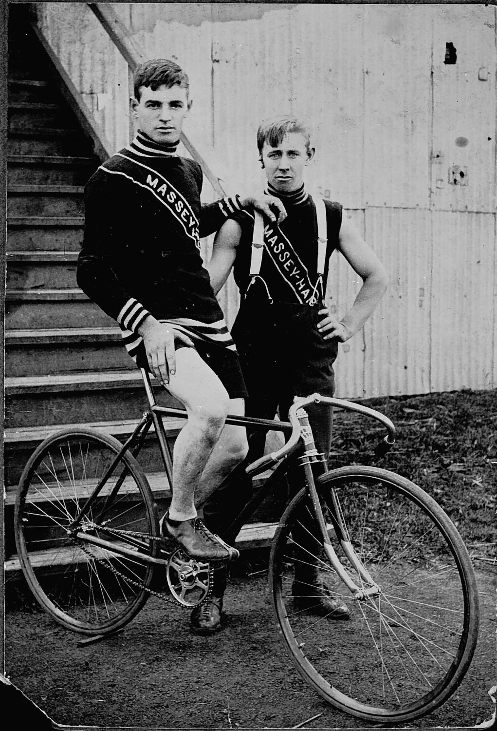 Two cyclists. Both wear jumpers (one sleeveless) bearing the name 'Massey Harris'.
