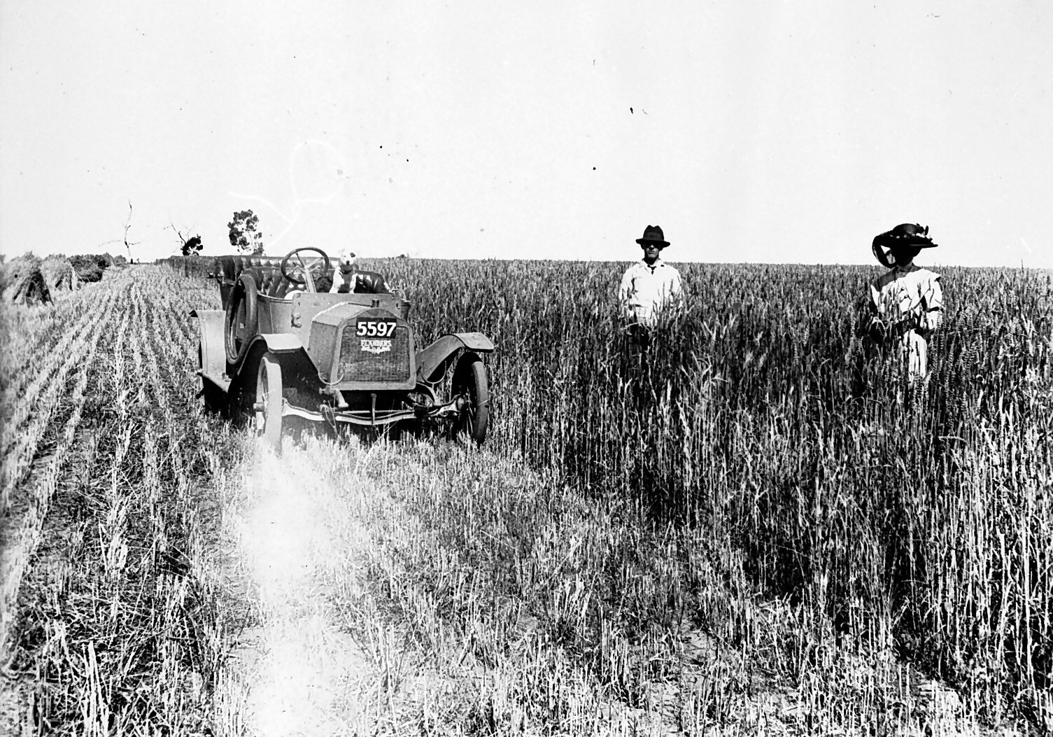 A man and a woman standing in a crop. There is a Flanders car on the left.