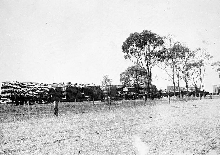 Wheat stacks at Jeparit. There are a number of horse-drawn vehicles.
