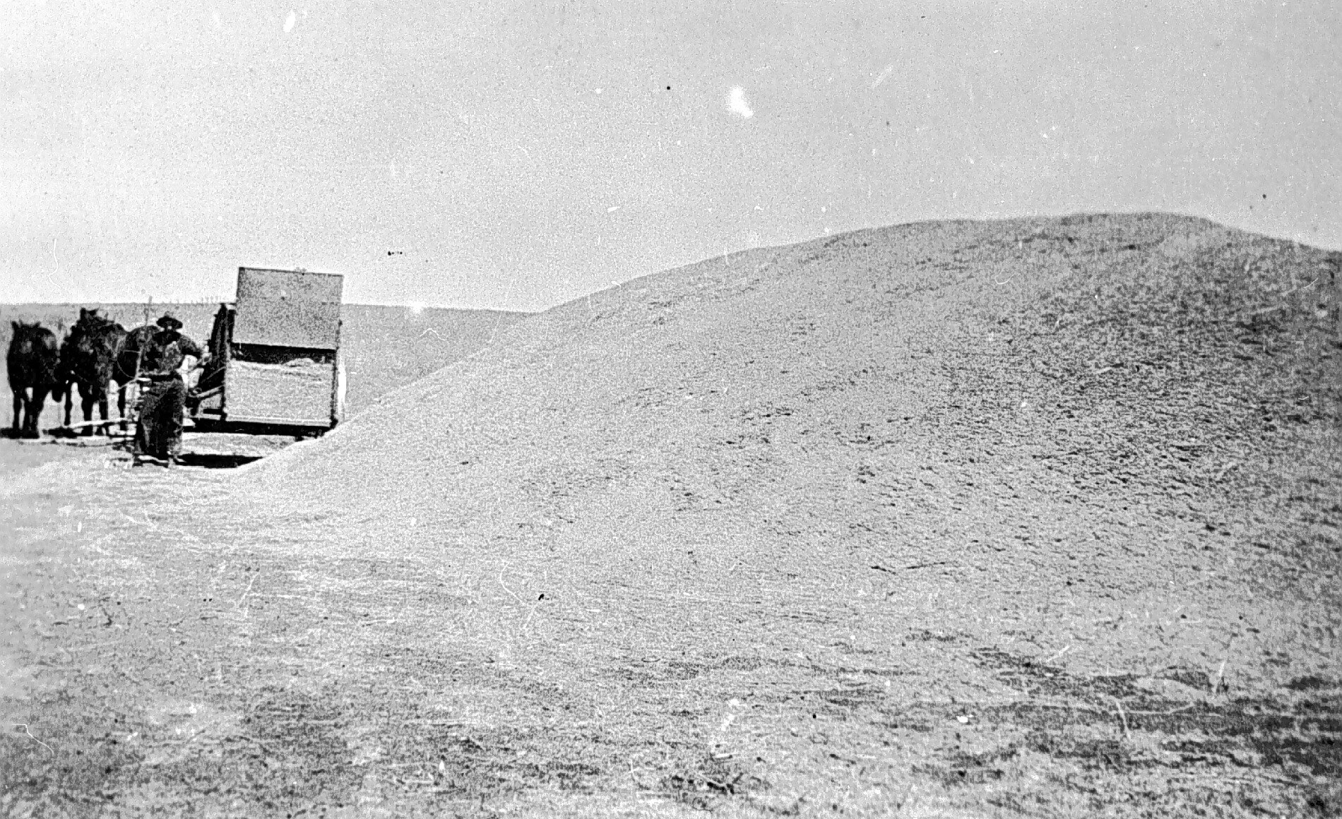 Emptying the Braybrook stripper at the heap that produced 300 bags on block 60. Two years before the paddock had been Mallee scrub.