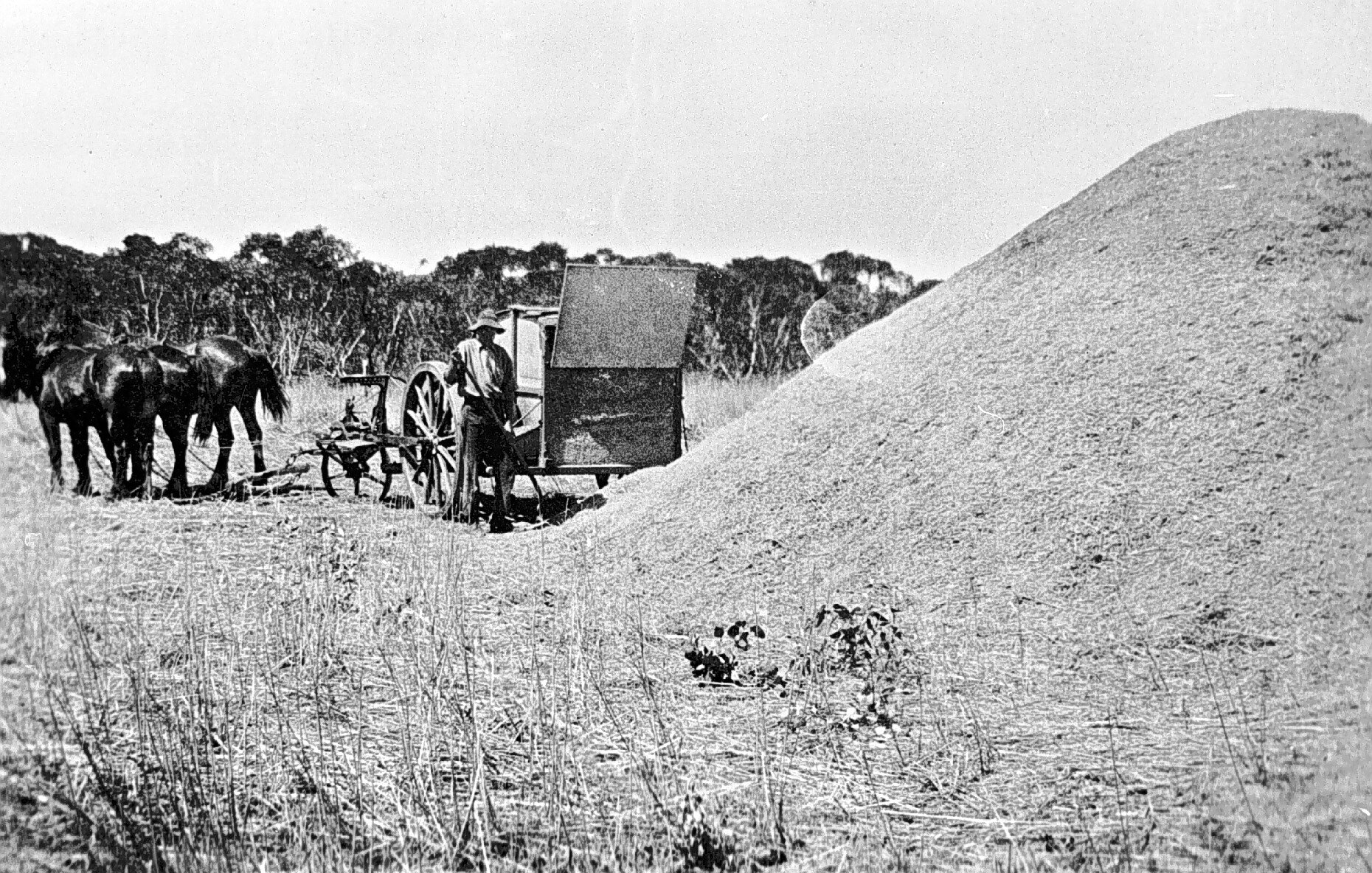 Farm worker unloading grain & chaff from the rear body of a Braybrook stripper drawn by three horses onto a heap waiting for winnowing.