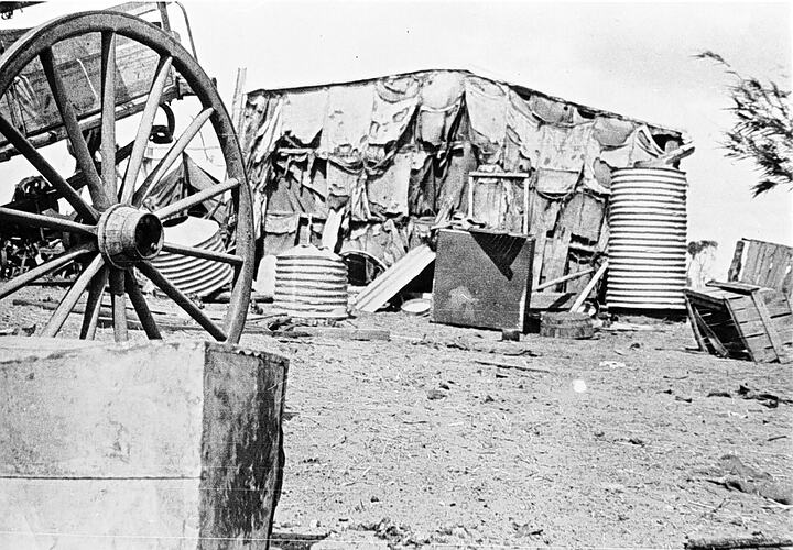 A farm house constructed out of superphosphate bags. They were known as 'Florida Villas' as that was the brand name on the sacks. There is a cart on the left of the photograph.