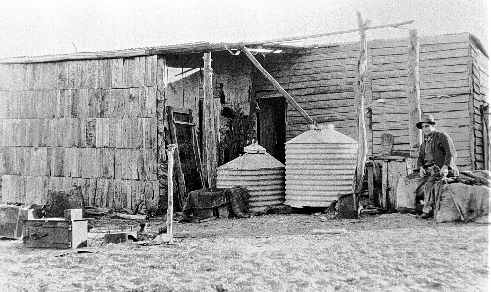 The back of a farm house showing two water tanks. The building is constructed from palings, tin, hessian and sides from vacuum oil company boxes. The iron chimney encloses a large open hearth, a colonial oven sits on sand on the left The house was built by Jack Holt.