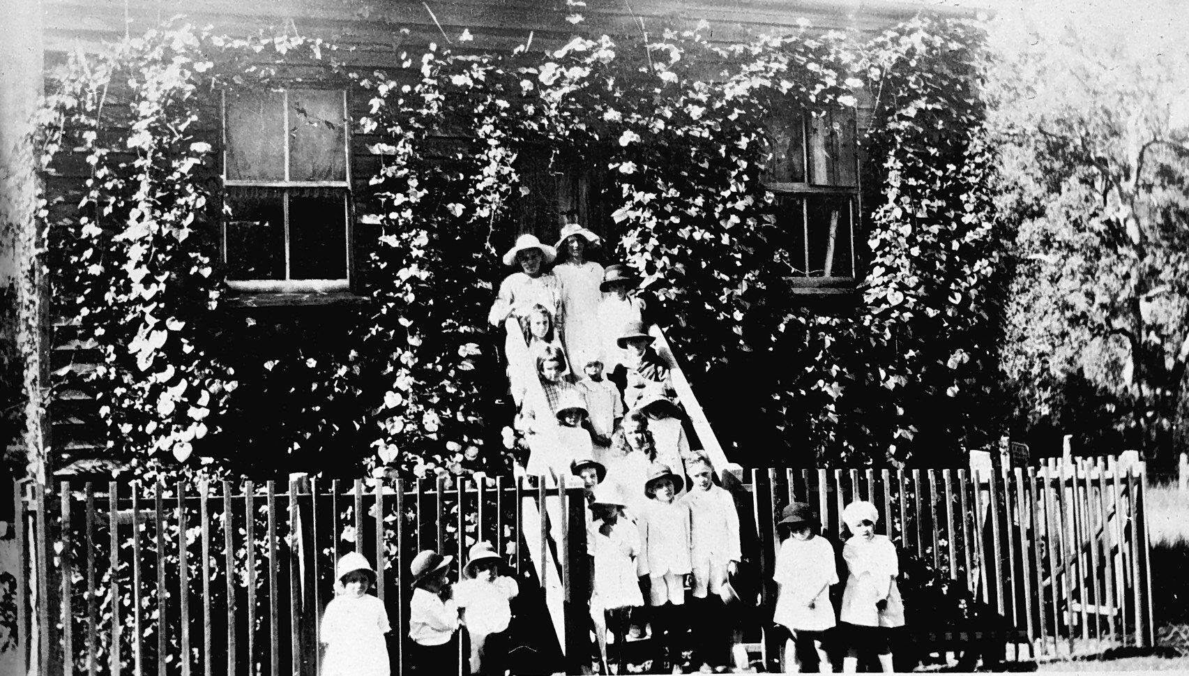 Children in front of the Louisavale School. The school is covered in ivy.