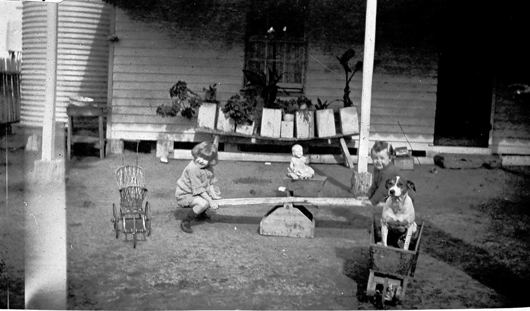 Two children on a seesaw. There is a dog seated in a toy wheelbarrow on the right and there are a number of plants in kerosene tins in the background.