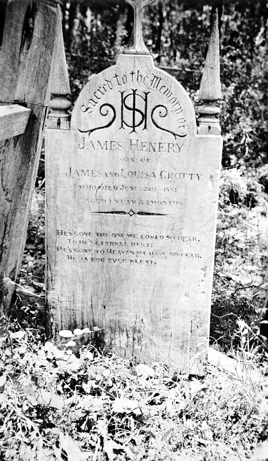 Wooden headstone of James Henery Crotty, son of James and Louisa, who died aged 1 year and 8 months on 24 June 1881.