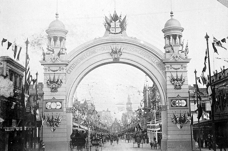 An arch commemorating the visit of the Duke & Duchess of Cornwall & York at the time of Federation.