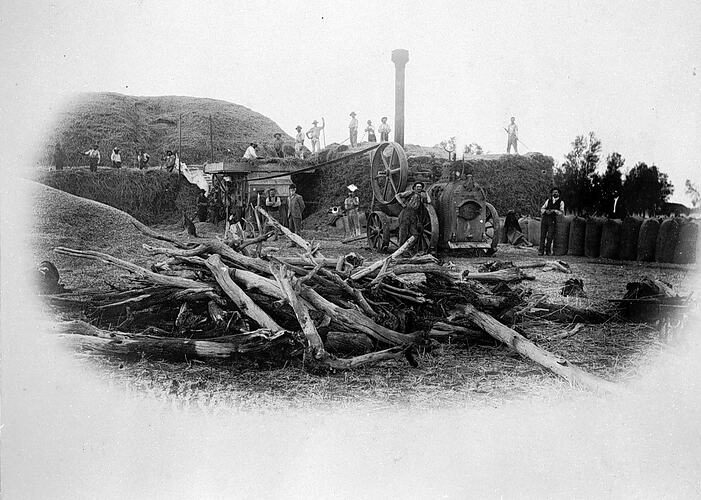 Agricultural Workers, Australian Native Animals, Farms, Kangaroos, Portable Steam Engines, Threshing Equipment, Woodpiles