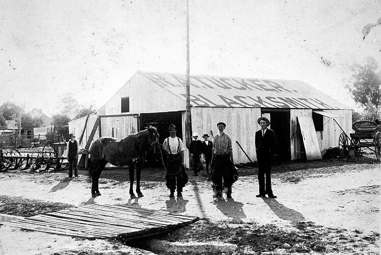 A number of men with a horse outside the shop of R.A. Tucker, Blacksmith. There is a bridge over a gutter in the foreground.