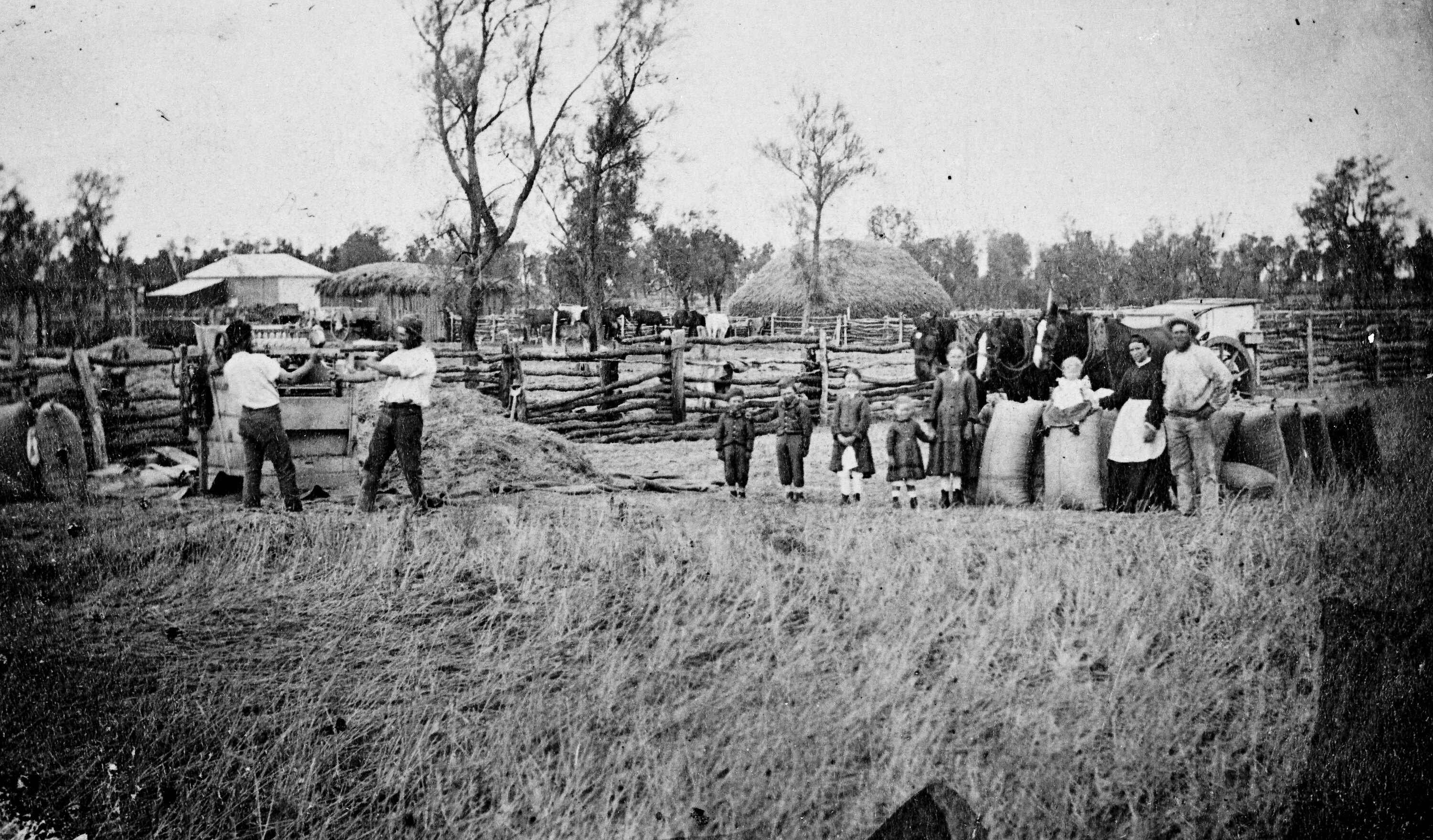 Black and white negative depicting a scene of the winnowing of a grain crop alongwith a family posing nearby at a farmyard at Kellalac, Victoria, circa 1815.
