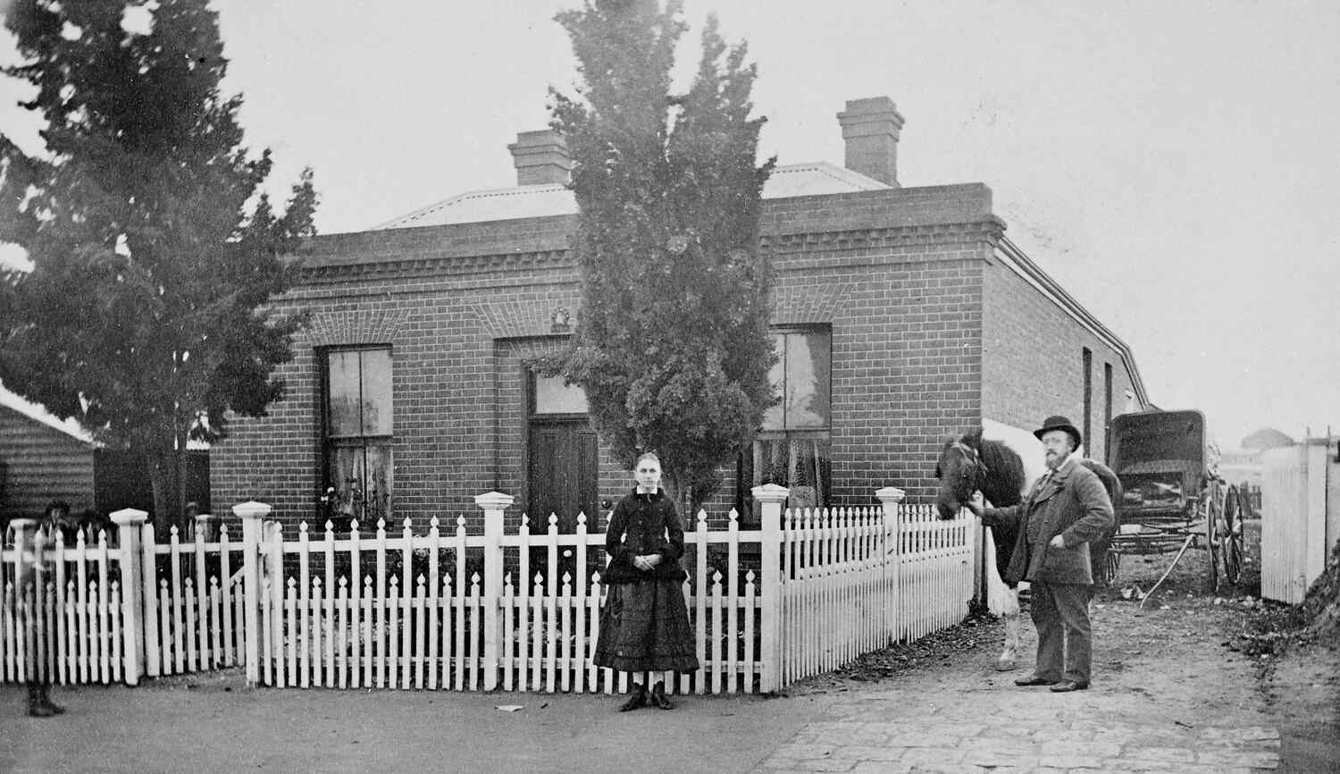 Black and white negative of a man and girl posing in front of a brick house, possibly in Horsham, Victoria, circa 1885.