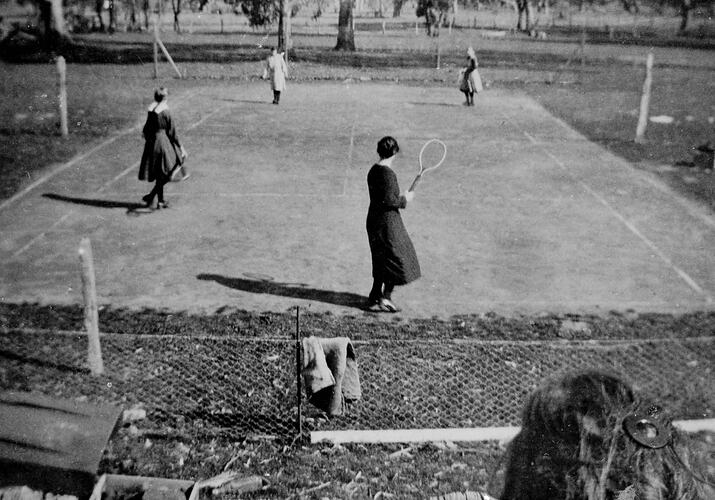 Black and white negative of four girls playing tennis, Ashens, via Murtoa, Victoria, 1925.