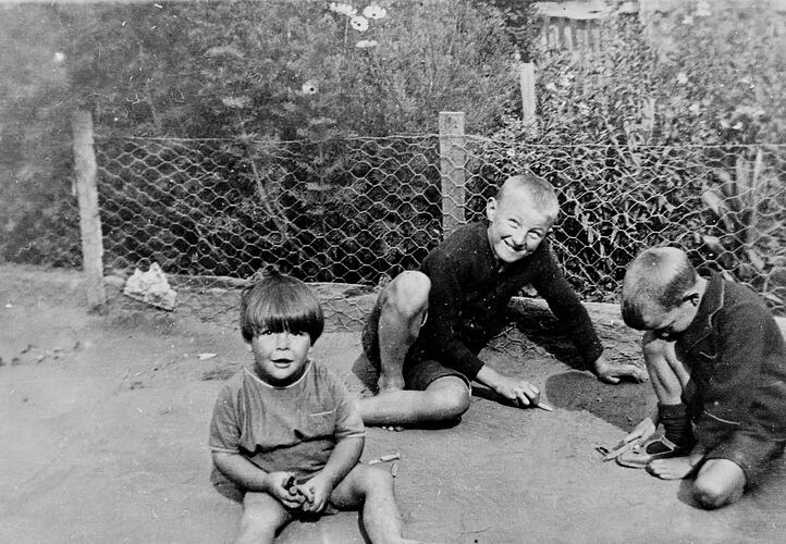 Black and white negative of three boys playing with wooden pegs at Ashens, via Murtoa, Victoria, 1924.