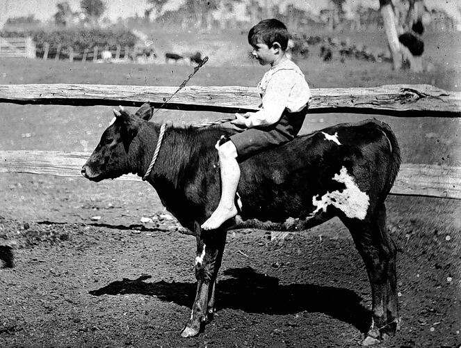A boy on the back of a calf. There is a halter around the calf 's neck.