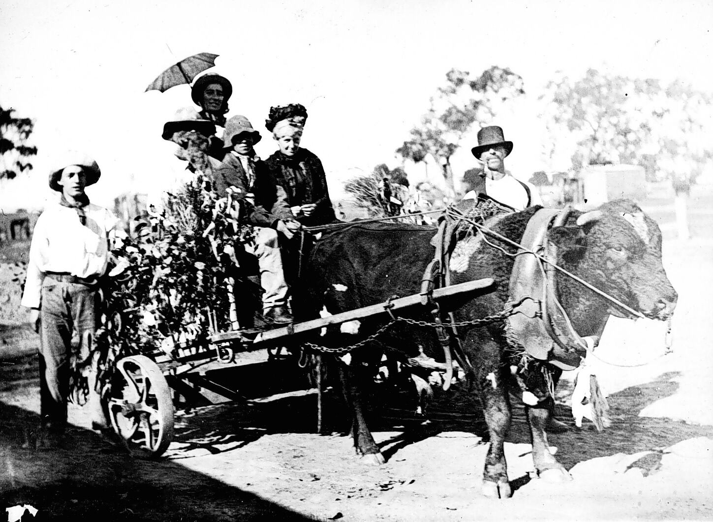 A group of people in a cart drawn by a bullock. The cart is decorated with foliage and the people appear to be dressed for a function - possible an early settler re-enactment.