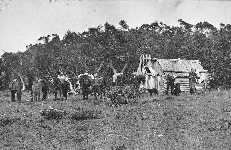 A group of men with their horses in front of a bush hut.