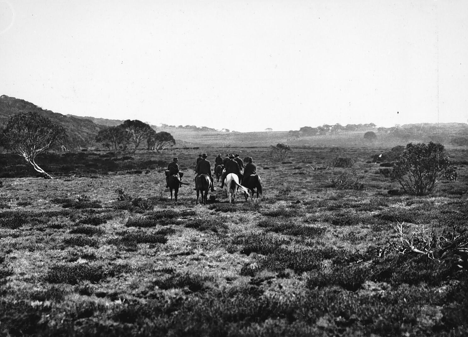 A trip by a Victorian Government minister (unnamed) into the mountain country north of Maffra. The group riding across Holmes Plain. (one of a series of images, see also MM 007815-007834).