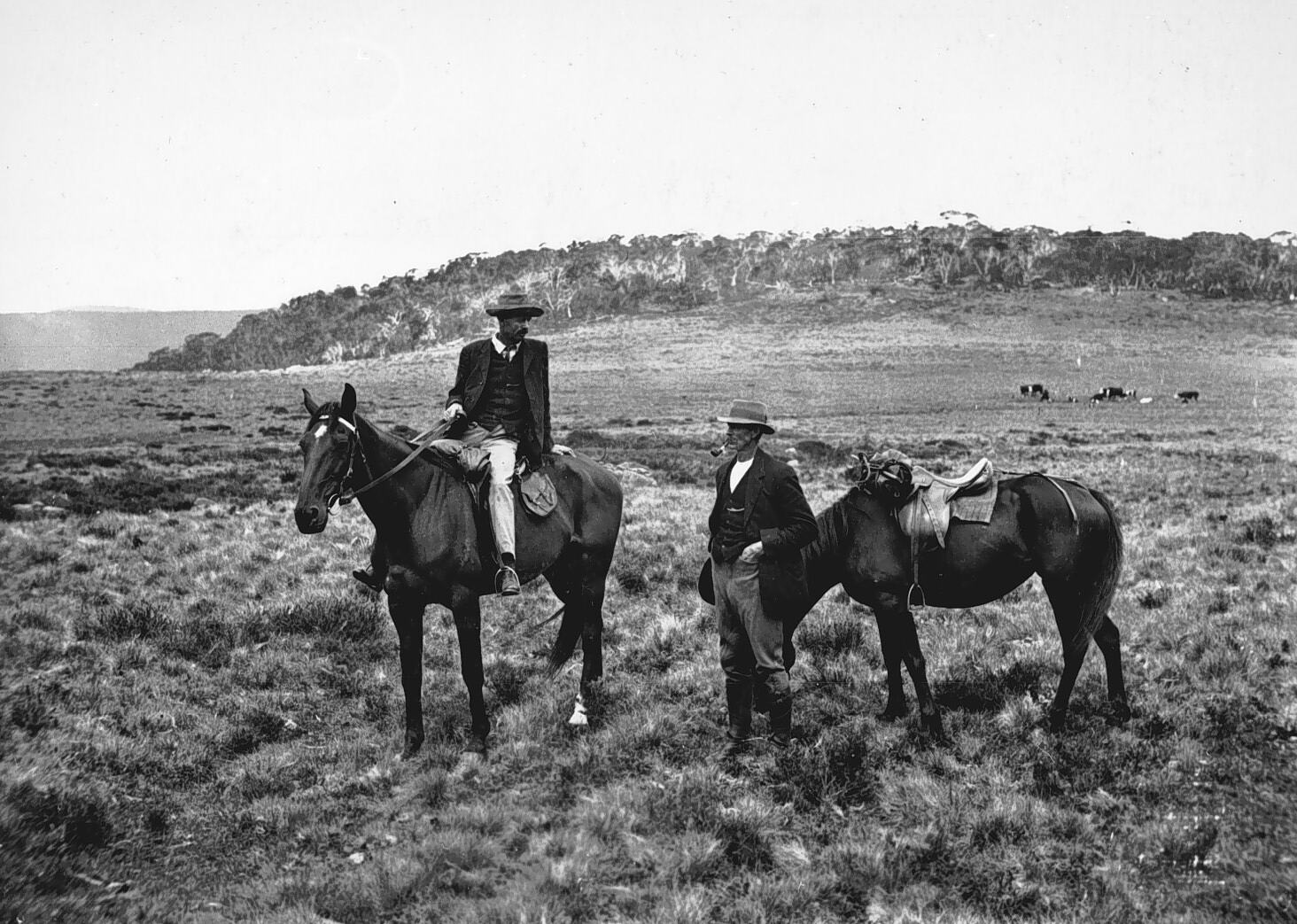 A trip by a Victorian Government minister (unnamed) into the mountain country north of Maffra. Two men, one on horseback, one beside his horse on the Mount Howitt Plains. (one of a series of images see also MM 007815-007834).