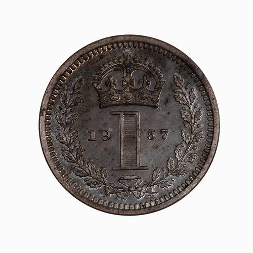 Within an open oak wreath the numeral 1 dividing the date 1957; above, crown.
