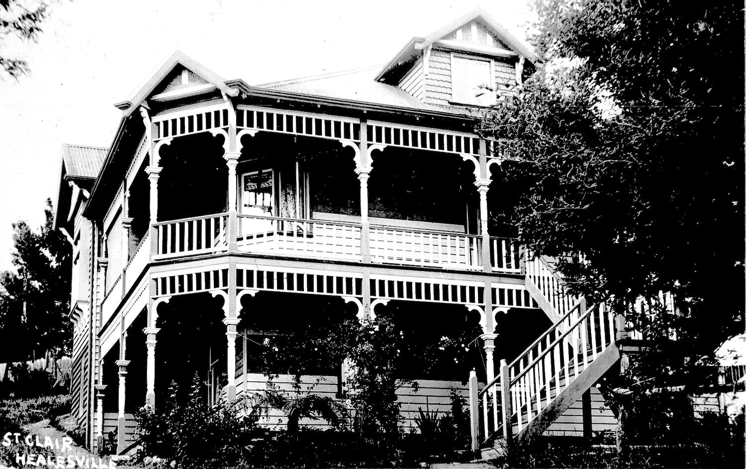 The St Clair Guest House, Healesville. A two-storied large weatherboard house with wide verandas on both stories; there are some attic rooms. Wooden turned verandah posts; the house is freshly painted. The house is built into the side of a slope, and there is some washing hanging on the line in the back garden. Ferns and roses in the front garden, and steep wooden steps to the upper level.