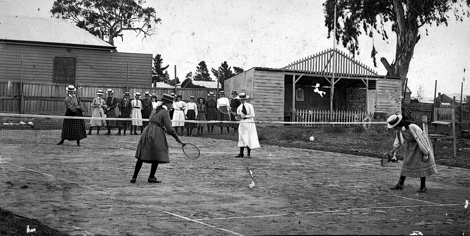 A group of schoolgirls playing tennis.