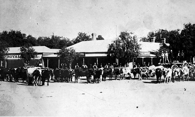 Bullock teams in the street of Swan Hill. The Royal Hotel is in the back- ground.