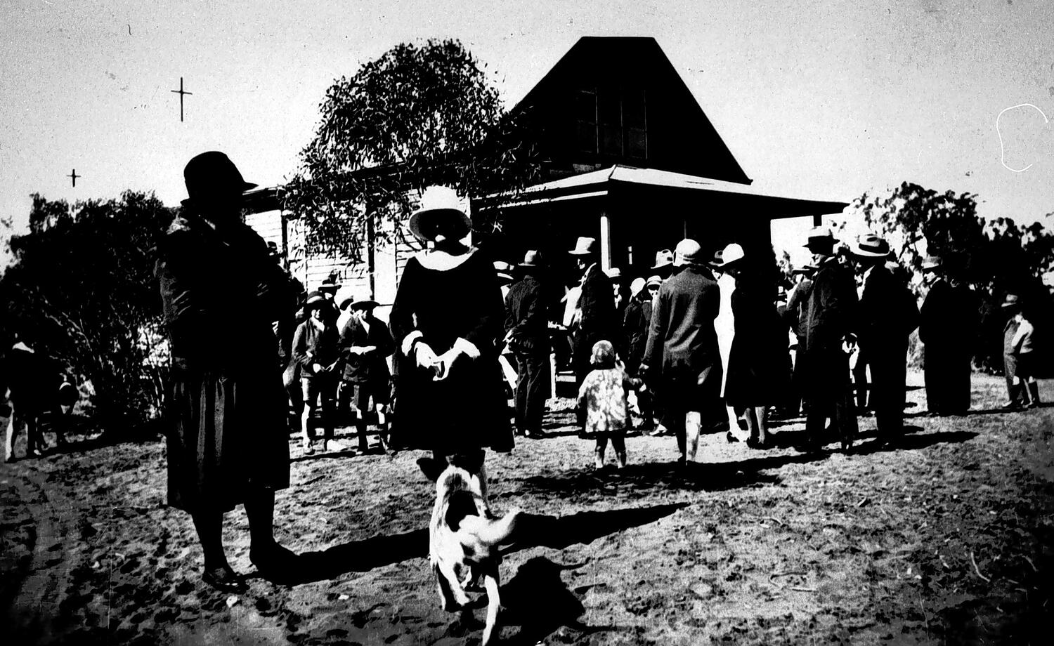 People assembling for services at the Red Cliffs Church. The dog in the foreground is 'Brutus' and belonged to the Gray family.