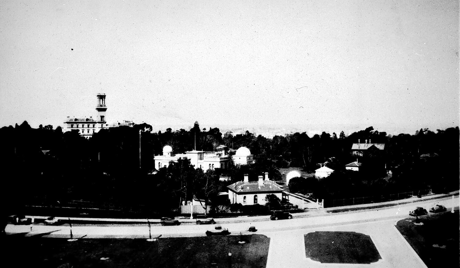 View overlooking Melbourne Observatory and Government House from the Shrine of Remembrance, circa 1935. The Royal Botanic Gardens are also visible in background.
