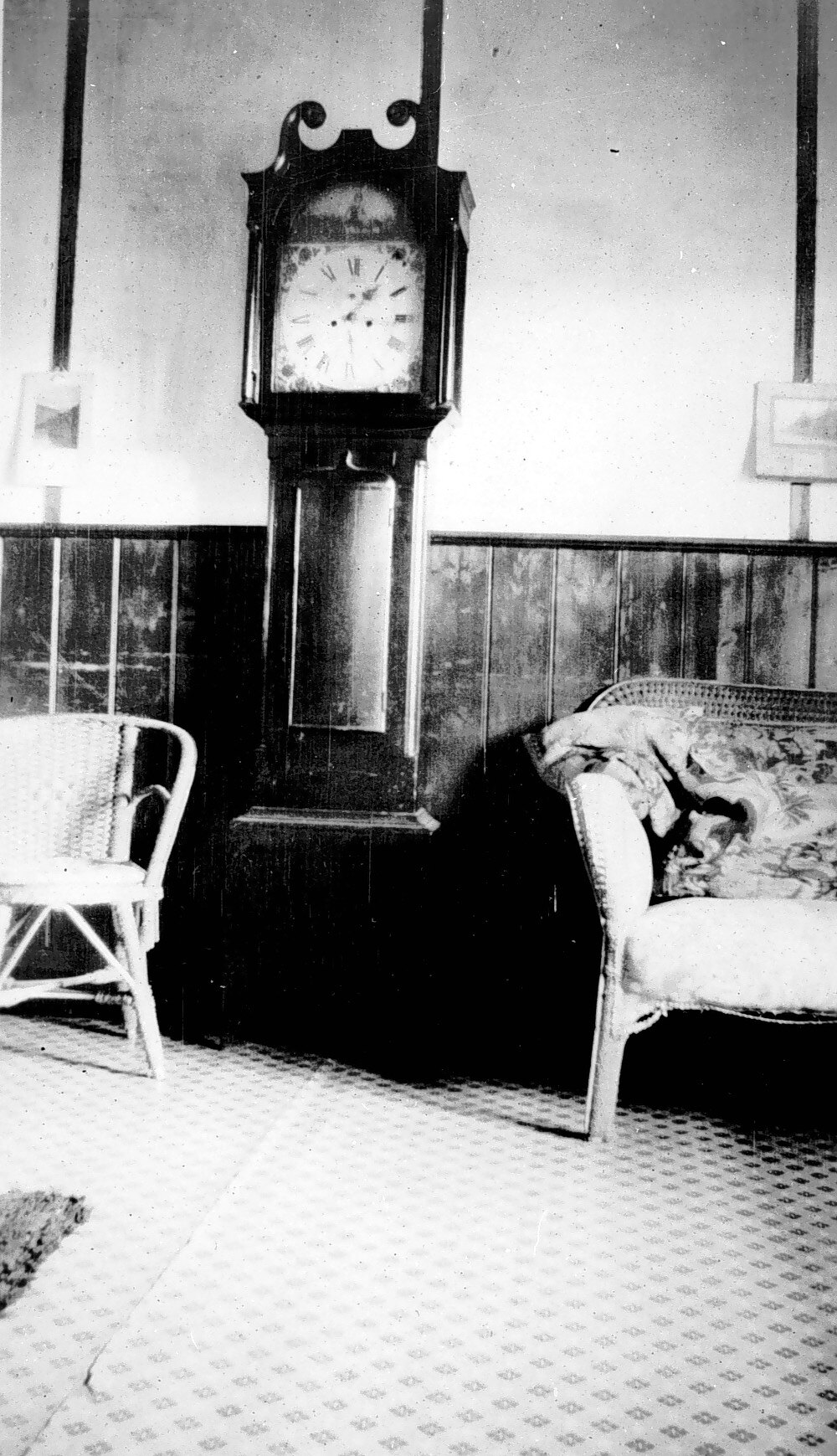 Inside a sitting room with a grandfather clock flanked by a cane chair and a sofa.