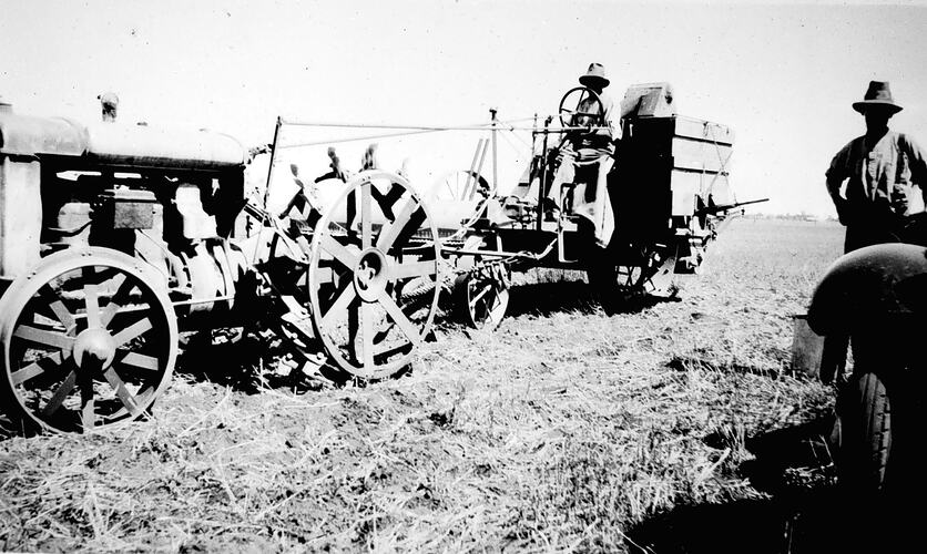 Fordson tractor and harvester on farm. The Fordson appears to be modified for single person operation from the harvester seat.