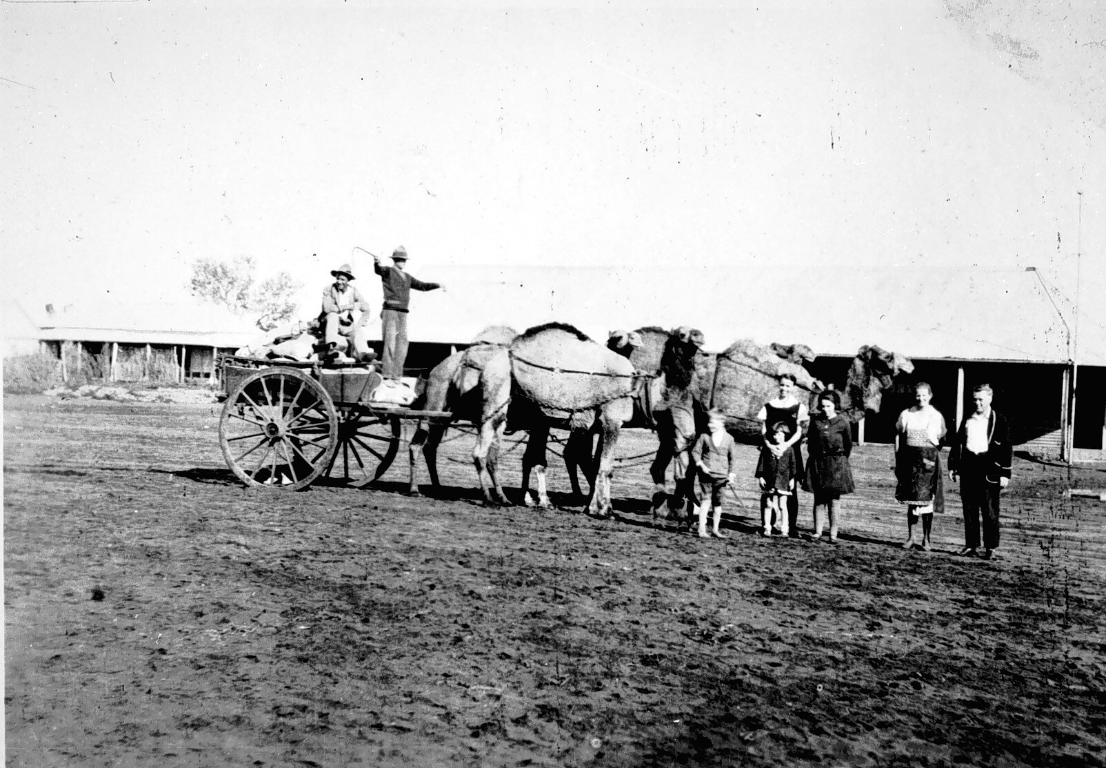 A family group in front of a wagon drawn by camels. There are two men on the wagon.