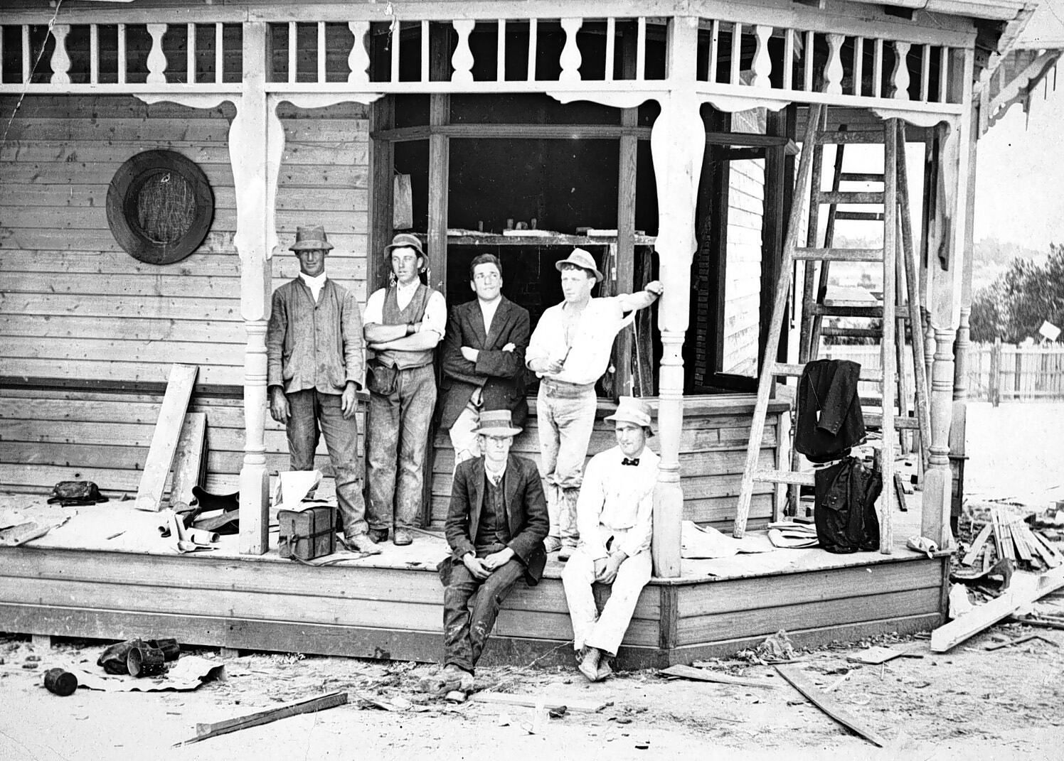 Builders on the verandah of a house under construction.