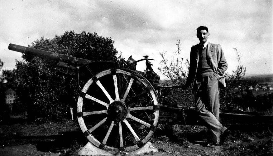 A man standing beside a German 77mm field gun captured during World War I. It is likely to be a FK16 field gun, introduced into service in 1916.