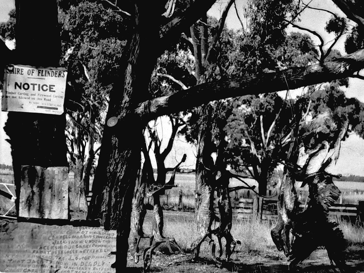Five fox carcasses and an eagle hung from a tree. There is a notice from the Shire of Flinders attached to the tree and a large handwritten notice at the base of the tree which may relate to the shooting of foxes.