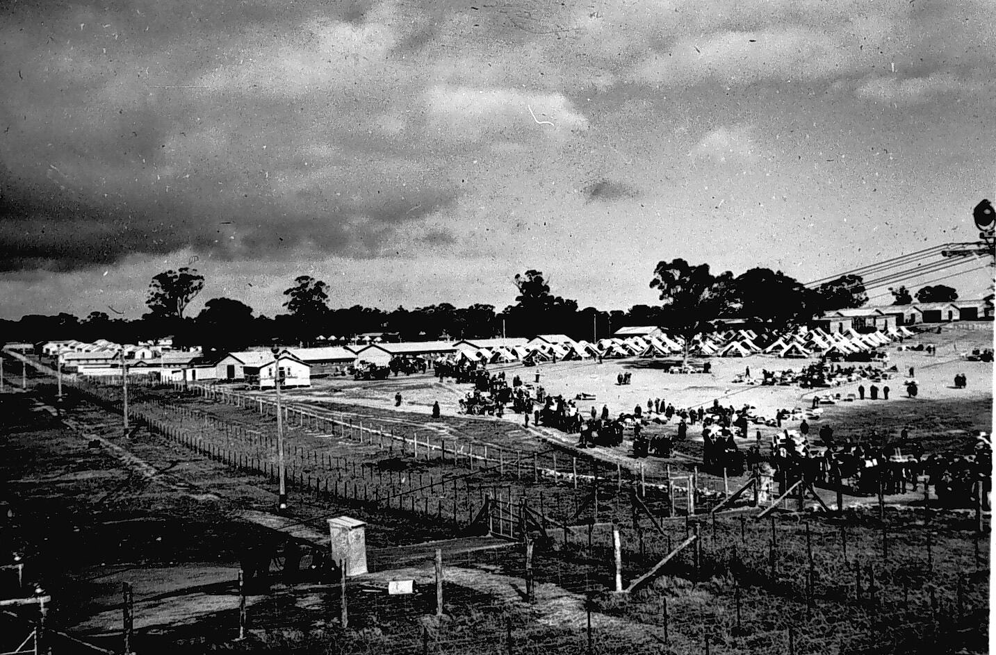 Prisoner of war camp showing huts, tents and barbed wire. A number of prisoners are in the open area. No. 13 Prisoner of War Group, Murchison, Victoria.